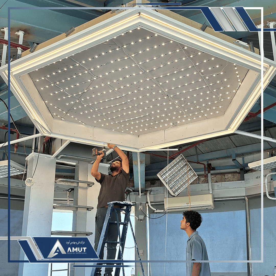 * امکان چاپ سفارشی: در این پروژه، طرح منطقه بندی ناحیه عسلویه و شهرهای اطراف در مرکز سقف چاپ و اجرا شد.