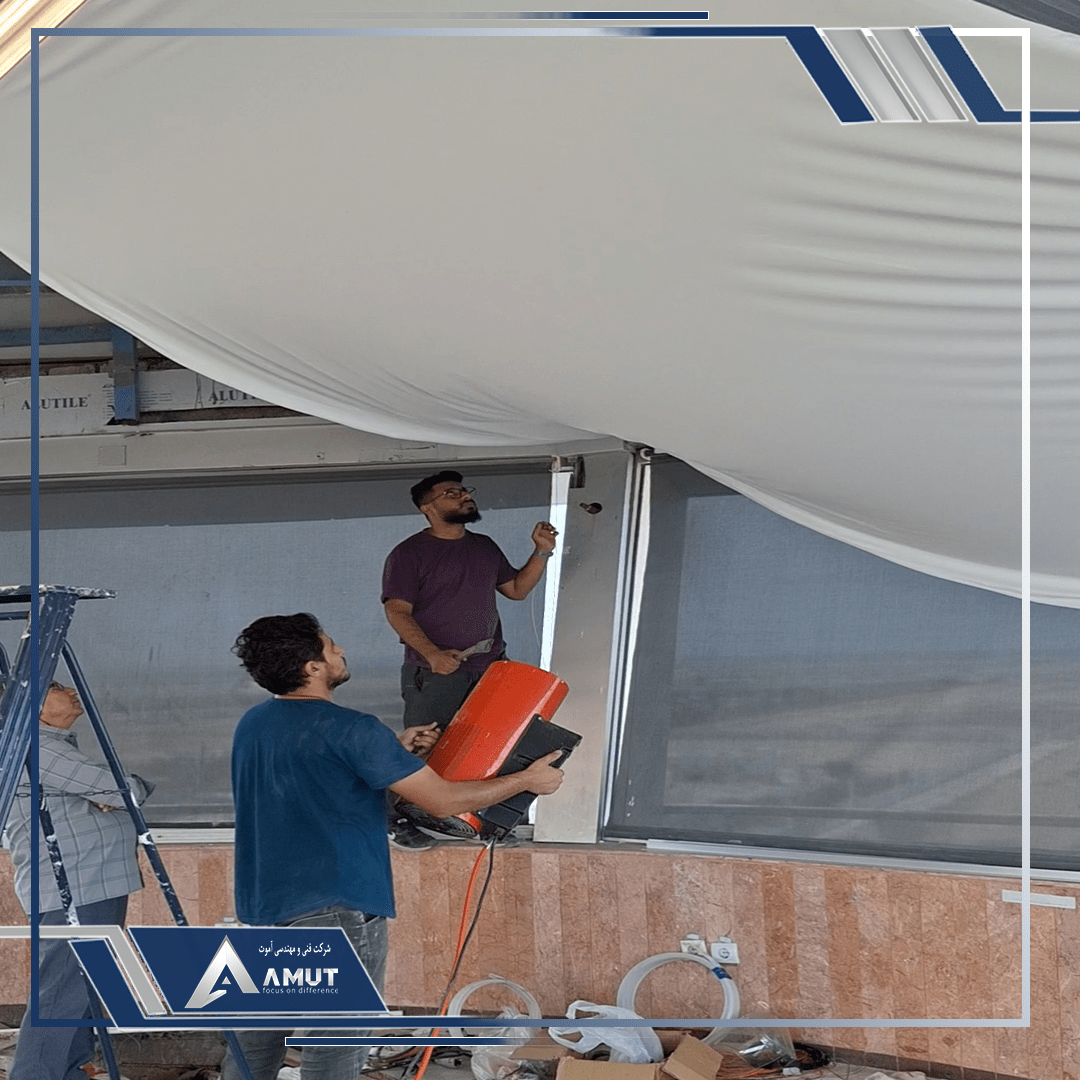 برای نصب سقف کشسان نیاز به حرارتدهی یکنواخت بود تا متریال کشیدگی مناسب را پیدا کند. این فرآیند با استفاده از هیترهای مخصوص انجام شد و تیم اجرایی با دقت بالا موفق به اجرای دقیق و بینقص سقف شد.